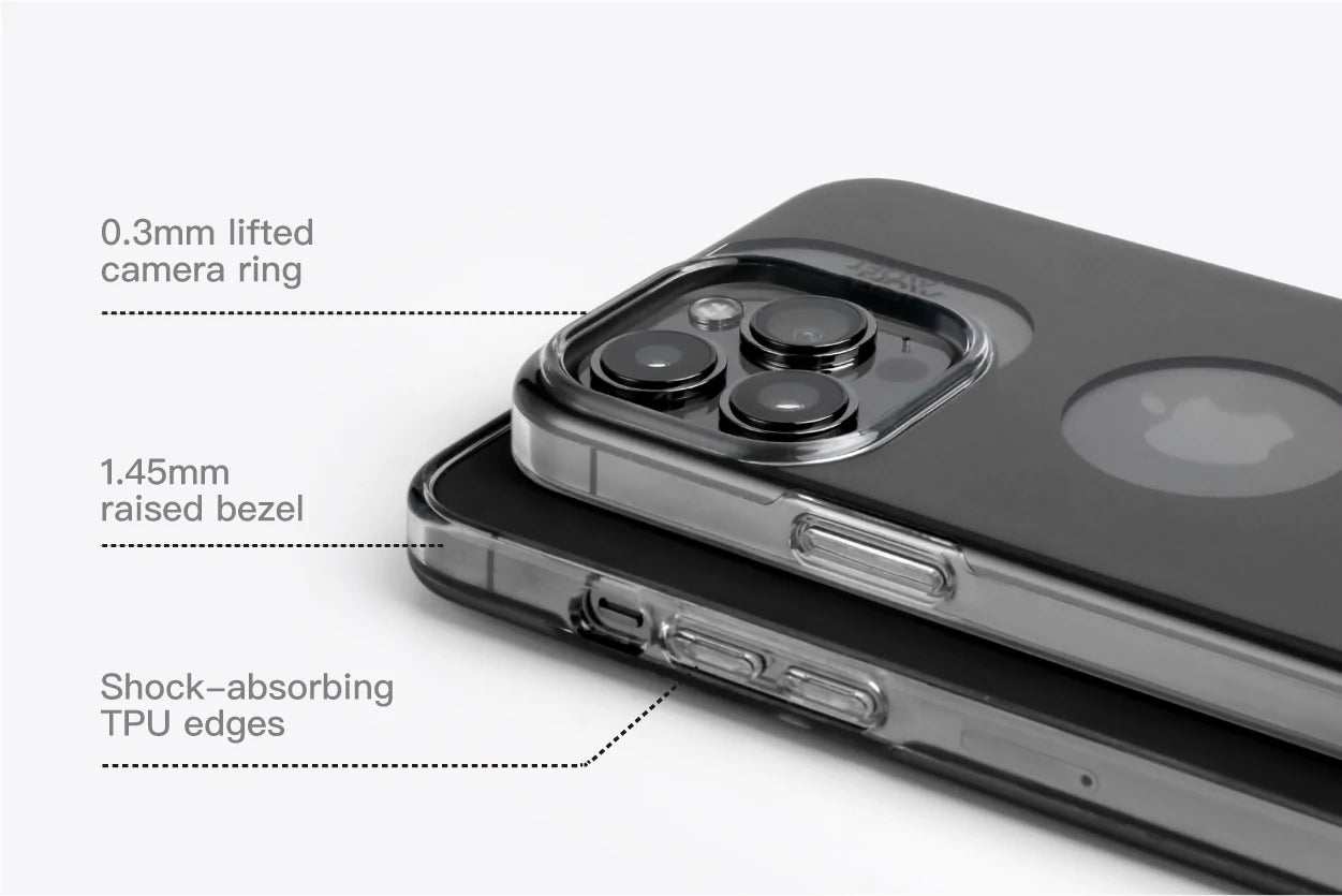 Die schlanke Hülle lässt die ursprüngliche Farbe Deines iPhones durch klare Konturen, transparente Kanten und durchsichtige Details erstrahlen, während das kühle Weiß oder Rauchschwarz von der Glasoberfläche schimmert, wenn es ins Licht fällt.