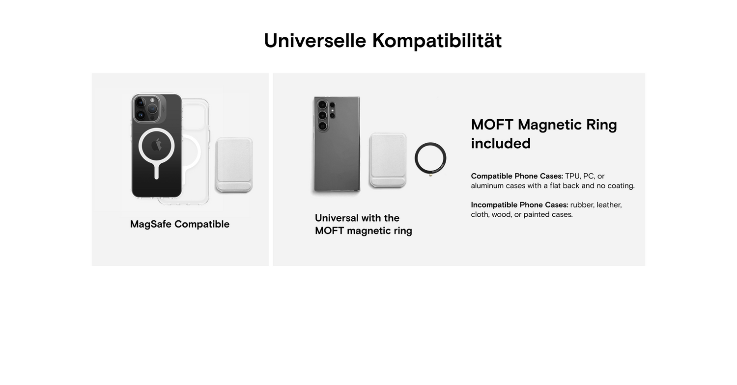 - Nicht-MagSafe-iPhone und Nicht-Silikon-Telefonhüllen mit dem mitgelieferten MOFT-Magnetring (Hinweis: Der Ring haftet nur an Nicht-Silikon-Telefonhüllen)