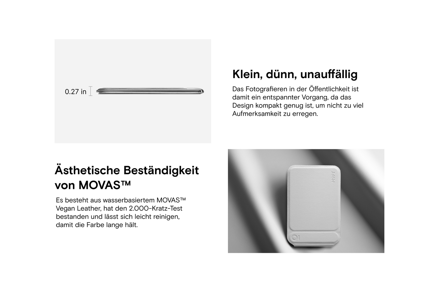 - Material: MOVAS™ Veganes Leder, Magnete, Metallplatten, Fiberglas, PC