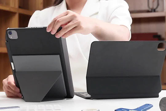 Die dünne Hülle ermöglicht es, die magische Tastatur nahtlos anzuschließen. Der Ständer lässt sich flach zusammenfalten, ohne dass er ins Gewicht fällt.