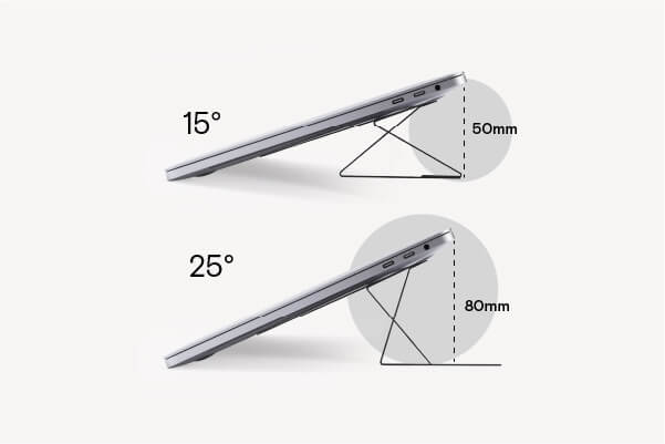 Der hohe Anstellwinkel optimiert Deine Körperhaltung im Sitzen und hebt das Laptop um acht Zentimeter an. Der flache Winkel hebt um fünf Zentimeter an und passt sich so perfekt an Stehpulte an.